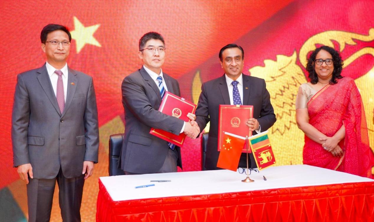 在阿马拉苏里亚总理和戚振宏大使的共同见证下,使馆唐彦棣参赞同斯教育部常秘卡鲁维瓦签署《援斯里兰卡普通教育数字化转型项目补充实施协议》。